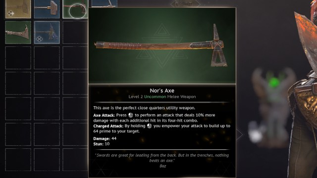 NorのAXでゲームを開始します。私はこれをこのリストのランキングの側面専用に含めています。 NORのAXはあなたが最初に得る武器ですが、それはかなり良いです。それヒットコンボが進むにつれて、より多くのダメージを与えますそして、攻撃を充電するときに、膨大な量のプライムを構築できます。
