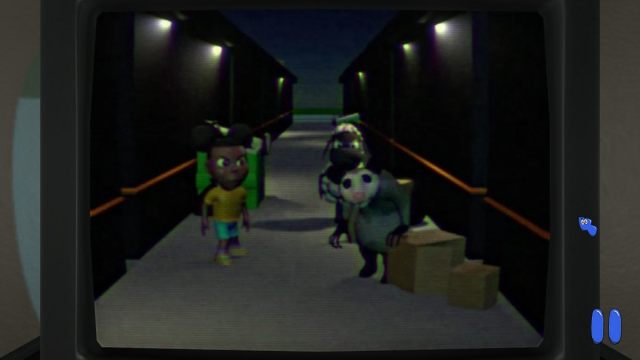 ライリーがケイトの屋根裏部屋でテレビセットを壊した後、仮面の姿は屋根裏部屋に現れます。最初のゲームのイベントを調べると、マスクされたフィギュアはケイトの職場に向かい、残りのテープを見つけて破壊します。テープを通り抜けるライリーは、彼女に大切なドリーを渡した後、アマンダの巨大な形に攻撃されます。彼女がライリーを攻撃することを控え、別のモンスター(画面外)の呼びかけに走るのは、羊毛のようなぬいぐるみを渡すことによってのみです。