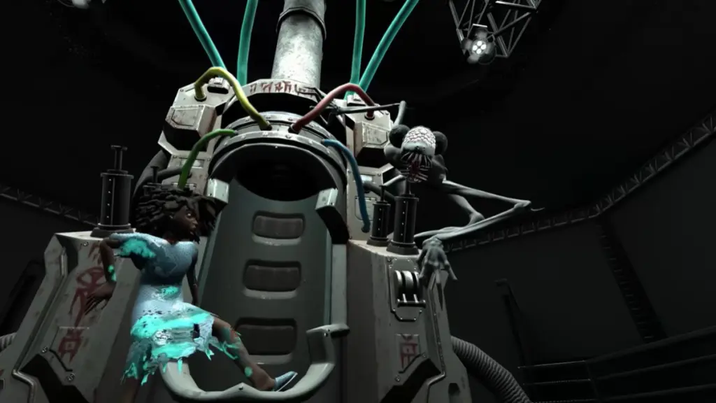 ポッドは明らかにアクティブであり、壁にはレバーが並んでおり、バックアップを作成するために制御室が使用されています。この部屋は、理論的にはレベッカの心を何度も複製し、彼女の魂をテープ全体に広めるアマンダ・ザ・アドベンチャラーのショーのコピーを作成するために使用されているようです。奇妙なことに、番組のこれらの古い録画には、これまで以上にギョロ目(おそらく捕らえられた子供たち)がいます。