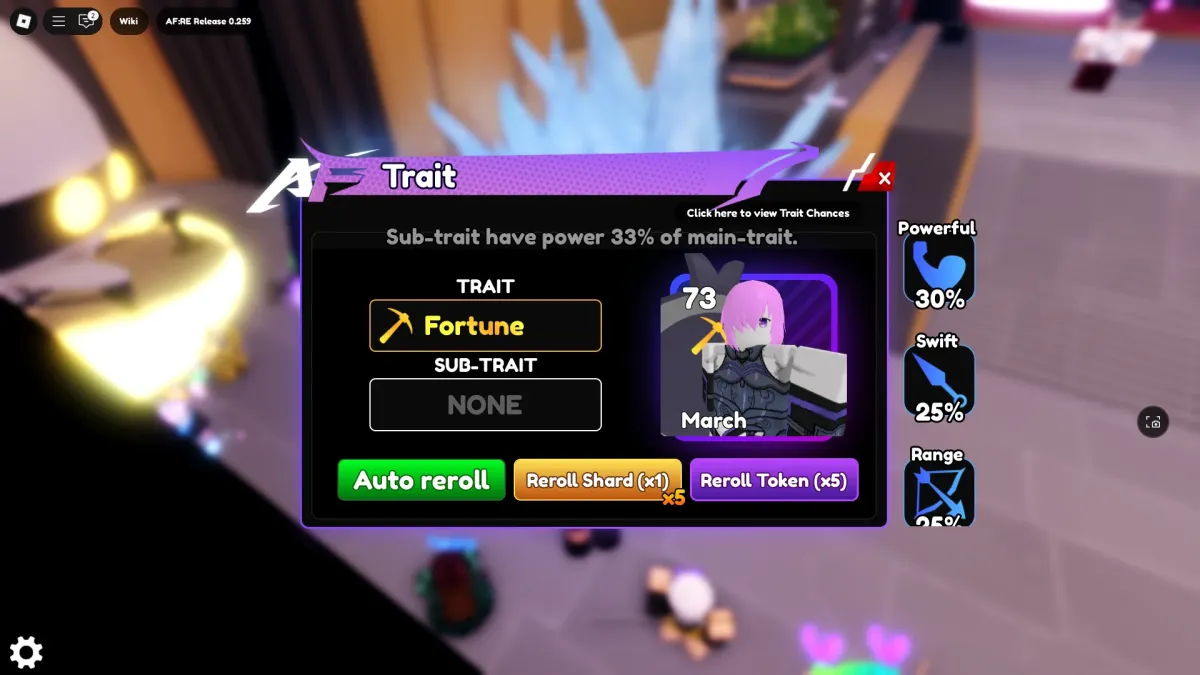The Traits Rerollメニューでユニットを選択すると、その特性を1回再ロールするために必要なリロールシェードの数がわかります。