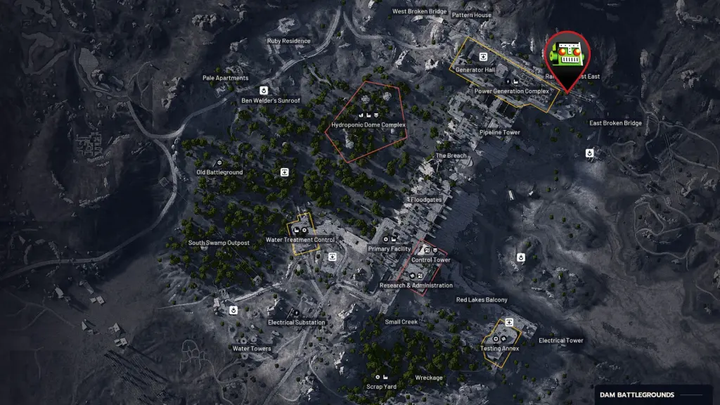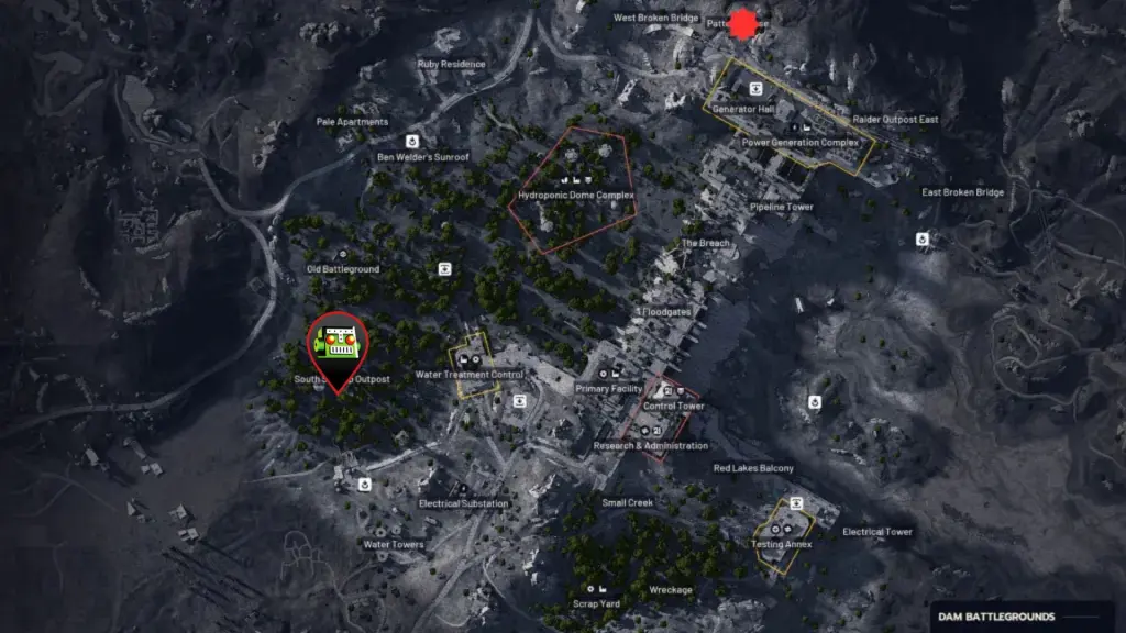 冷凍レイダー コンテナを見つけるには、コールド スナップ状態がアクティブなマップに移動する必要があります。冷凍レイダーコンテナは通常のレイダーキャッシュにすぎませんが、雪で覆われています。凍結されたバリアントでは、マップの状況に応じてより良い報酬が提供されます。私のお気に入りのマップはダム戦場マップです。上のスクリーンショットでマークされているスポットを見てください。