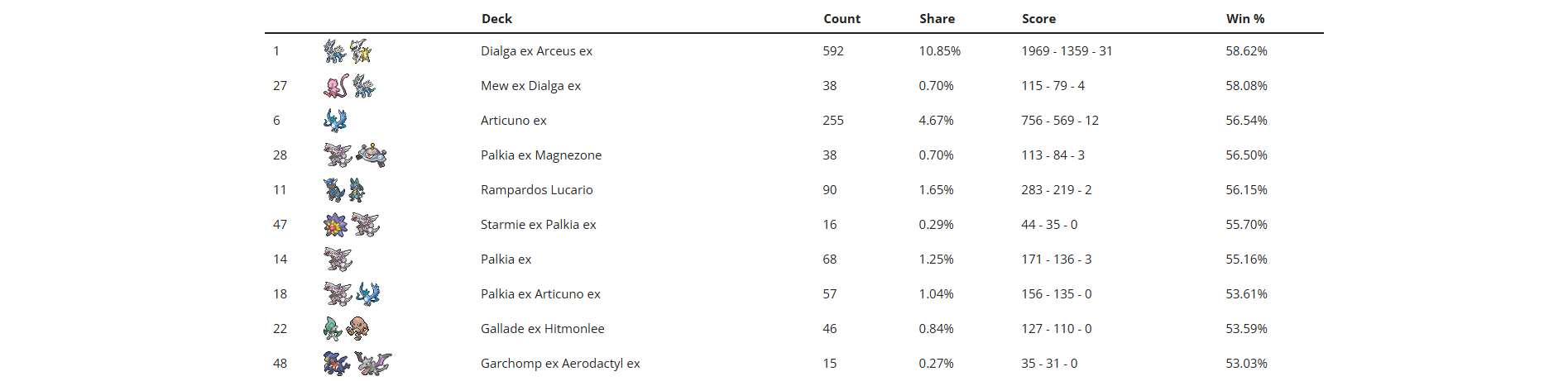 - 最も使用されているデッキは、Arceus ExとDialga Exの組み合わせで、58.62%の勝利を誇っています。