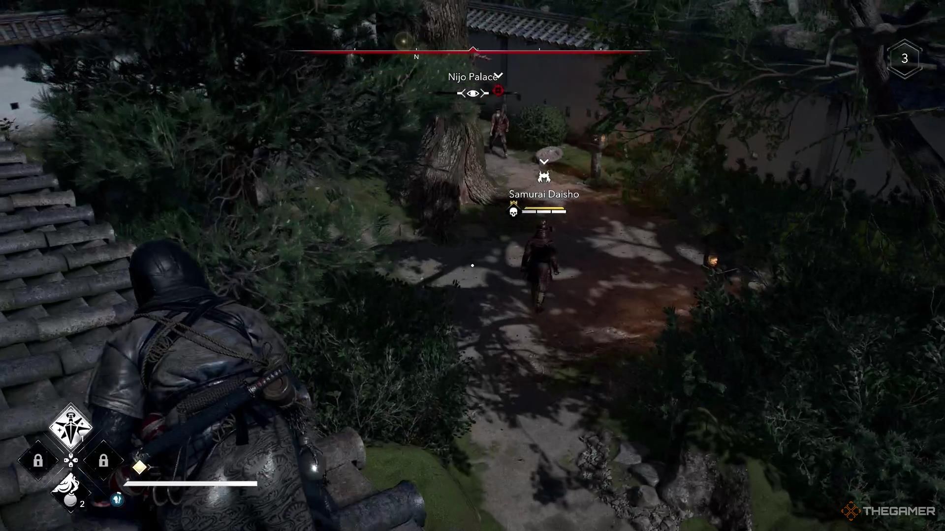 2番目のサムライはです北東側では、その角をパトロールします。近くには2人の警備員がいます。1つは小さな部屋があり、もう1つは池の近くでパトロールします。近くにたくさんの茂みがあり、これを作りますステルスに固執する簡単なエリア。