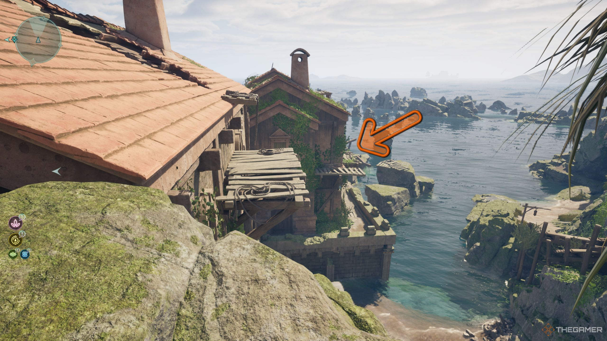 このプラットフォームに飛び乗って、建物の1つの屋根にジャンプできるようになるまで上がってください。あなたはこれらの建物から突き出ているいくつかの木製のプラットフォームを見てください、そして、これらに飛び乗って倉庫への穴に到達することができます。