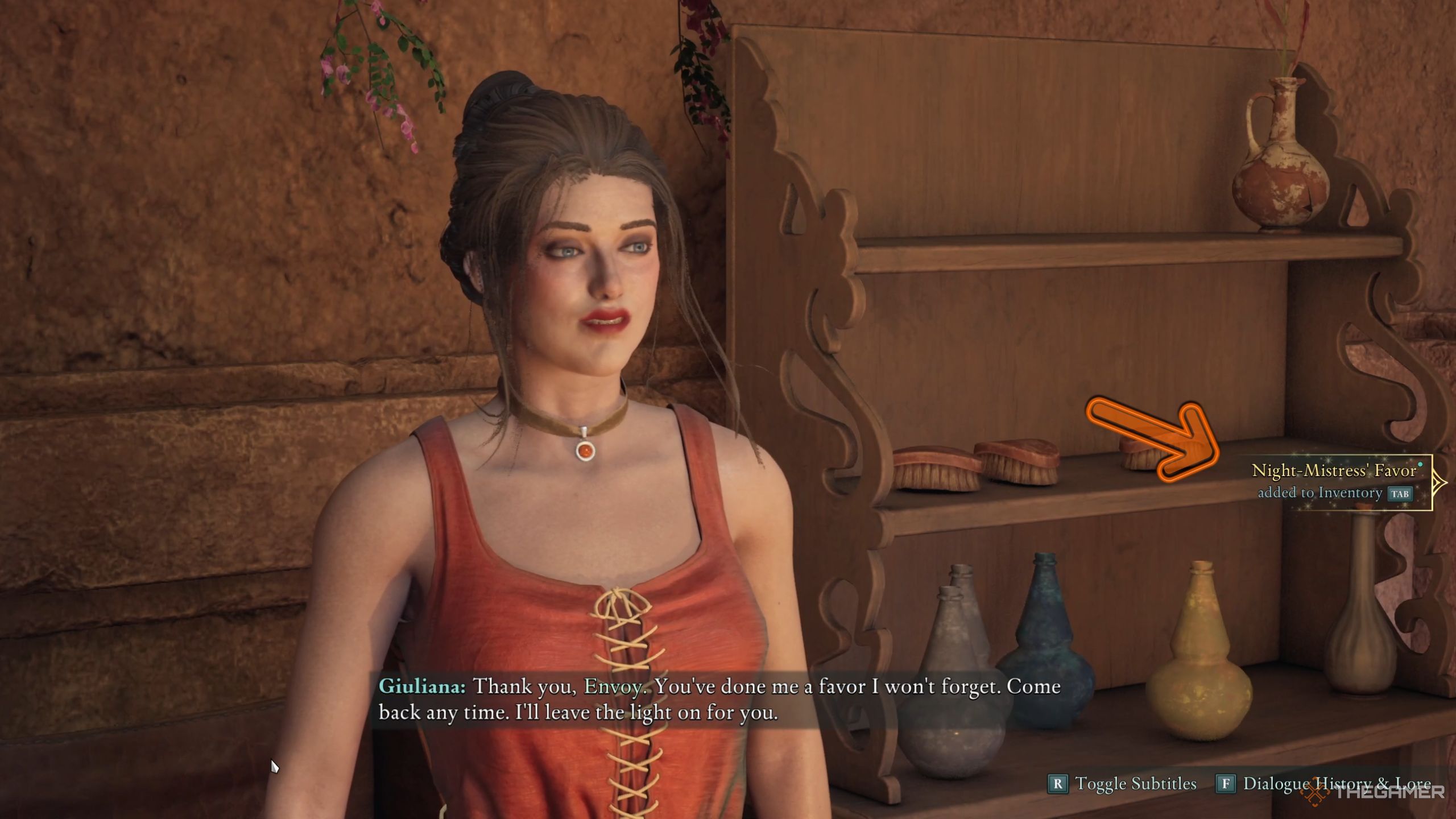 あなたが彼女にパッケージをうまく渡すことに決めた場合、彼女はあなたに300通貨を与えますナイトマストレスの好意あなたがあなたの仲間の近くにいるときに本質を再生することができるアクセサリー。この選択を選択すると、スパイを採用するのにも役立ちますドーンショアのメインストーリー中。
