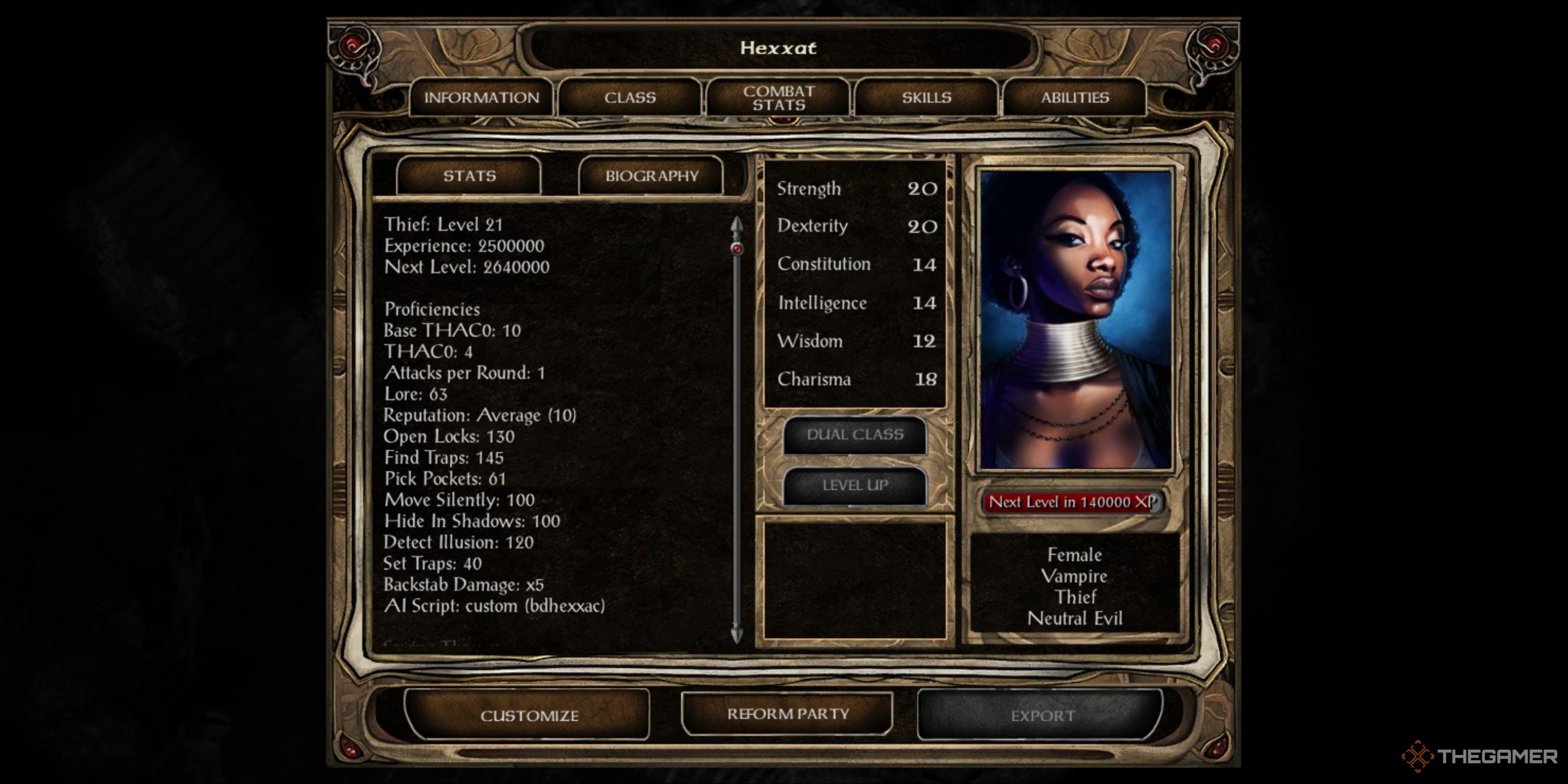 Hexxatは吸血鬼です。アスタリオンのような吸血鬼のスポーンではなく、彼女自身の完全な吸血鬼です。アスタリオンとの彼女の相互作用と彼のクエストラインは、たとえそれがパーティーのブラッドサッカーで倍増することを意味するとしても、魅力的だったでしょう。