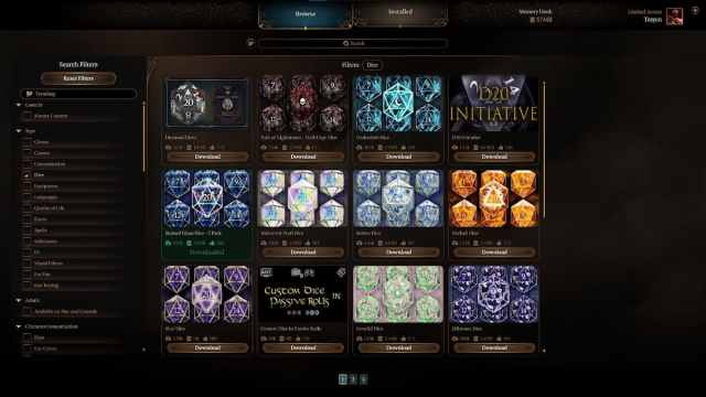 良いニュースは、BG3を開始するときにMODマネージャーを開くことで、追加のサイコロスキンを入手できることです。これは、ゲームの他のプレイヤーによる承認済みおよびアップロードされたMODのリストを示します。それらのいずれかから選択してゲームに追加します。サイコロセクションに行くと、ゲームに追加するために、独自に細工された独特のサイコロスキンの完全なリストを作成できます。