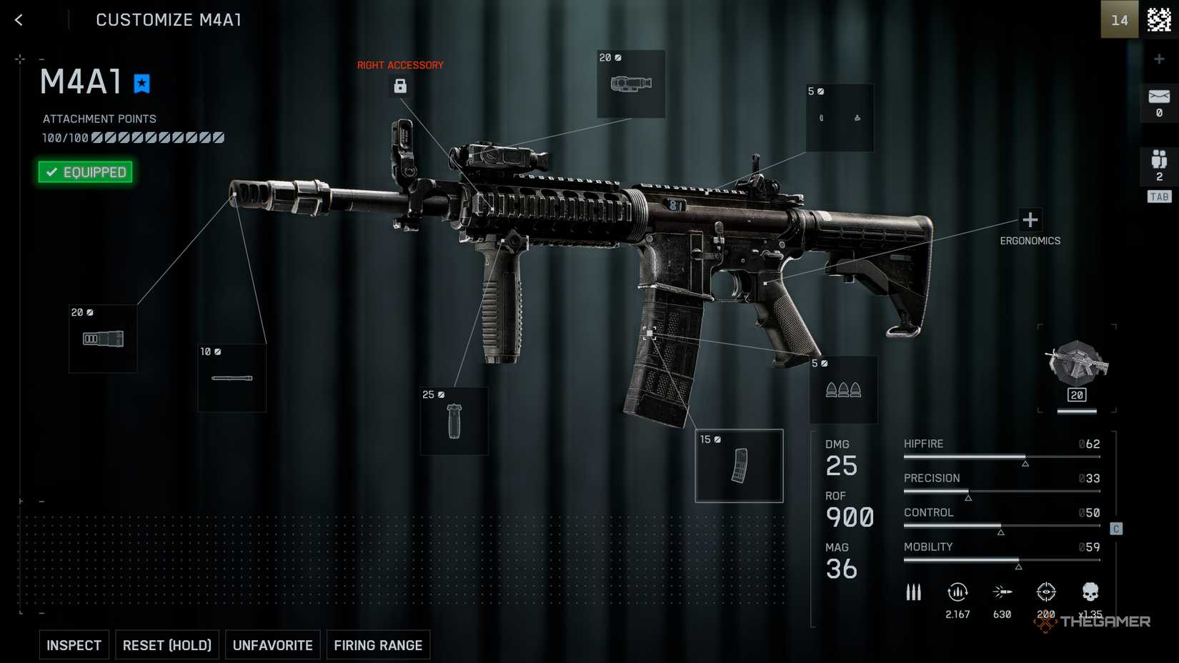この作業を行うには、いくつかの添付ファイルの銃を取り除く必要があります。16.5インチバレル実際には、コストが低いにもかかわらず、銃の弾丸速度の改善です。また、実行することを選択します鉄の光景広告中にレチクルの揺れを削除するため、5ポイントを節約できます。
