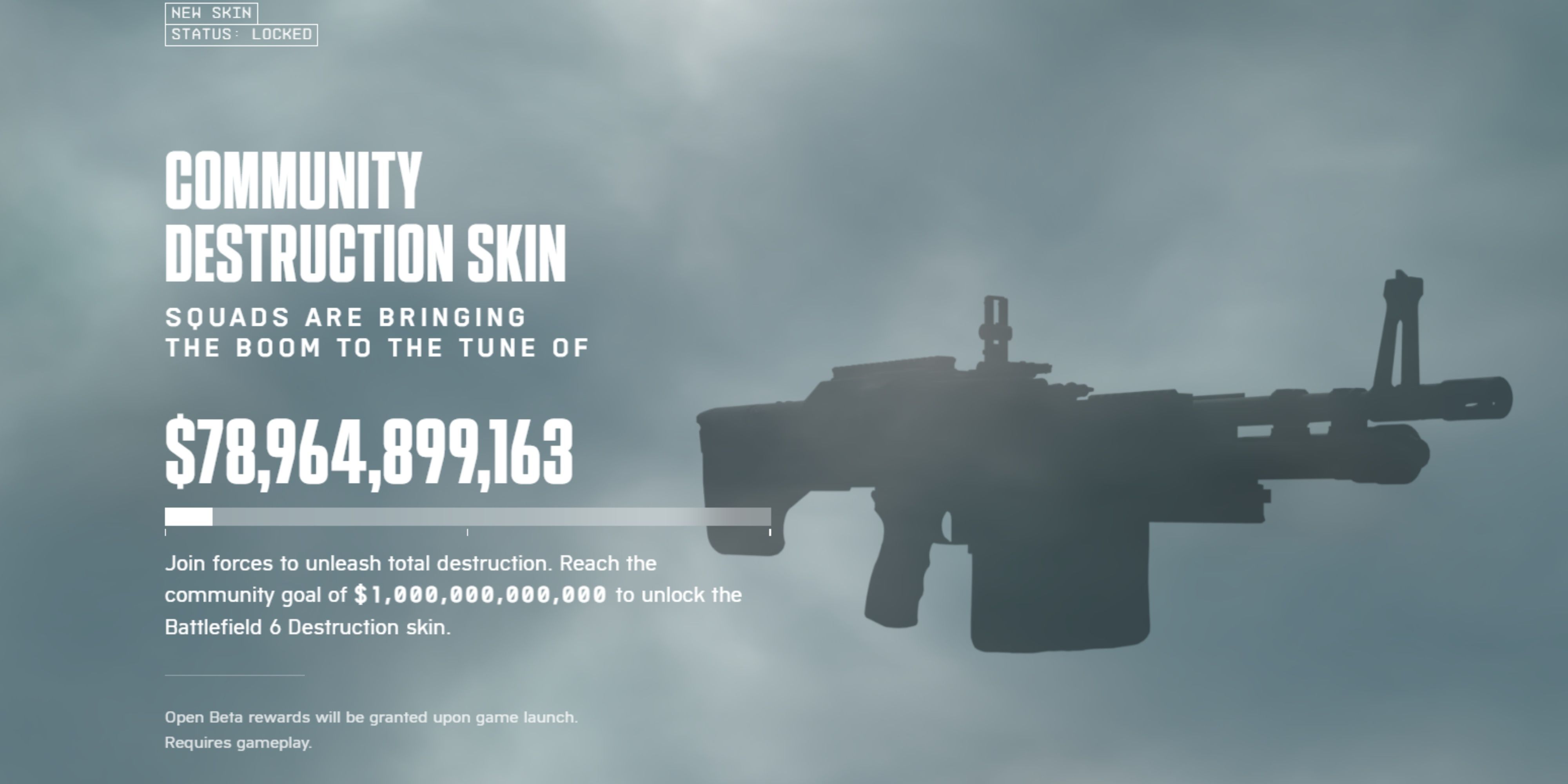 2番目のベータ版が日曜日に終了する頃には、1兆ドルのゲーム内ダメージにまとめて獲得できる場合、ラインにも賞品があります。彼はM60のコミュニティ破壊スキンです。 1兆ドルの障壁が破られている場合、ベータに参加するすべての人のために、皮膚がゲームに追加されると思われます。そうしないと永遠に失われたと思います。