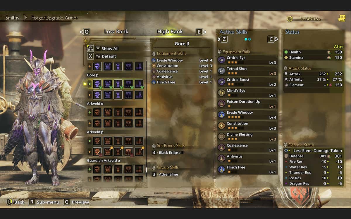 強力なゴアマガラセットは、ゲームのかなり遅れて到着しますが、いくつかの有望なスキルをもたらします。 4番目のレベルを持っていますウィンドウを回避しますArkveldやGore Magala自体のようなより速いモンスターに対して驚くべきことで、より大きな不死身のウィンドウを与えてくれます。合体スキルは病気から回復した後、エレメンタルダメージを増加させるため、元素ビルドに最適です。