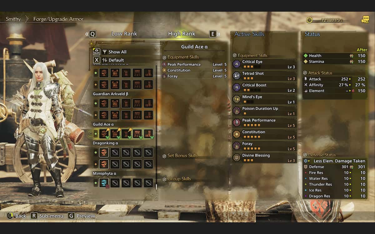 ギルドエースアルファセットは、希少レベル8の最初のメインアーマーセットであり、クラフトする特定の希少レベルの最も簡単なアーマーセットでもあります。装甲の防御統計は、気性に覆われた頂点の捕食者を狩り始めるまで、よく持ちこたえます。このアーマーセットは、リソースに影響を与えますピークパフォーマンスあなたの健康がいっぱいになったときにあなたにボーナスダメージを与えることを認める憲法スタミナをできるだけ高く保ちます。
