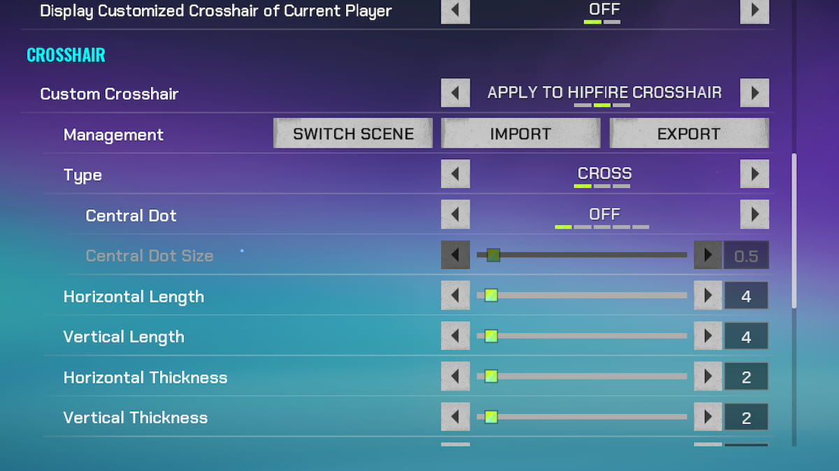 - デフォルトからのカスタムクロスハイヤーパーツをに切り替えて、Hipfireの十字線またはHipfireとSight Crosshairに適用します。