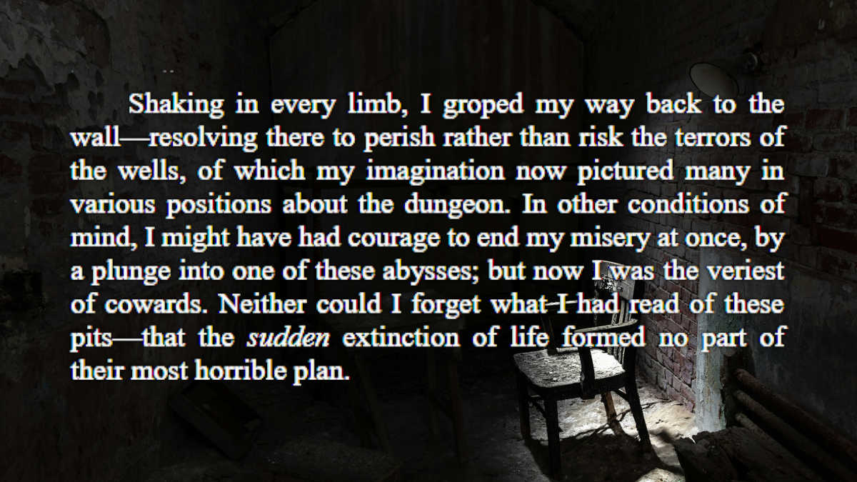 (歴史的に正確ではない)スペインの異端審問中に裁判官によって死ぬと非難された後、ピットと振り子の無名の語り手は、彼が彼のセルの真ん中のピットに落ちることに危険にさらされていることを発見します。振り子が際限なく揺れ動き、下降するにつれて、物語も希望と絶望の間で揺れ動くようです。