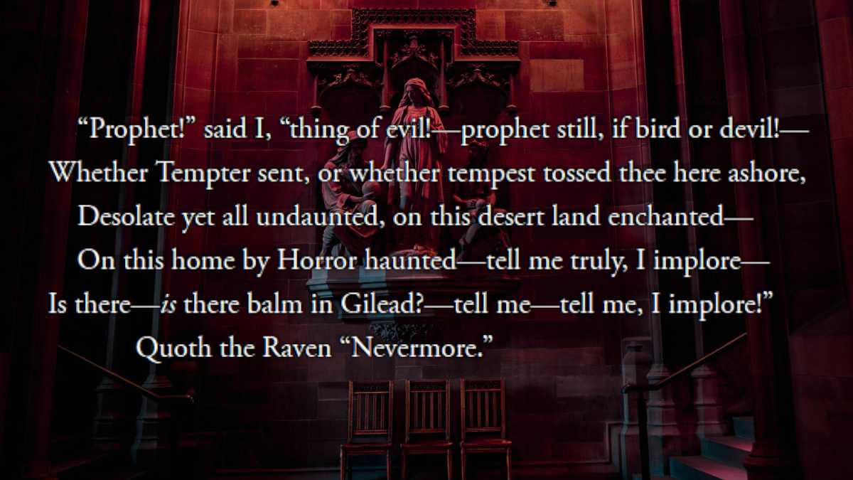 レイヴンでは、ナレーターは、レイヴンが家に入ってバストにとまり、彼の愛の死を乗り越えようとしています。レイヴンは、「ネバーモア」という言葉しか言うことができず、ナレーターは彼の家の中の鳥を見ながら怒りと熟考の間を揺さぶります。
