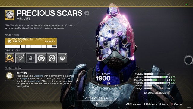 私は揺れました貴重な傷跡私のタイタンのヘルメットしばらくの間、それはおそらくクラスの最も粗いヘルメットです(上の写真)。私の本では、そのことを身に着けて回避する方法は勝利です。最後に、永遠の戦士と装甲の精神どちらも簡単に遊ぶことができ、まともなダメージバフを提供します。