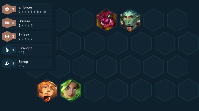 現在、TeamFight Tacticsの実験の最良のバリアントは、実験Twitch Flex Compです。計画は、合計4つの実験、1つのエンブレムをプレイし、強力なブルーザーとフォームスワッパーでボードをかなり上げることです。エンドゲームボードがどのように見えるかは次のとおりです。