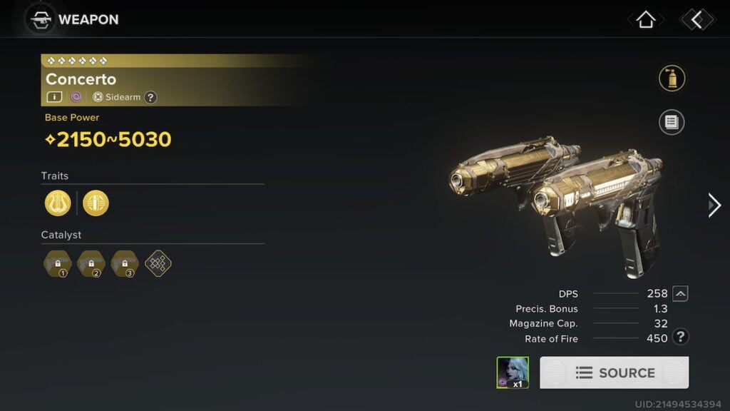 協奏曲特典、カデンツァが付いたエキゾチックなボイドサイドアームです。 Cadenzaは、最終的な打撃を受けたときに、武器の損傷を最大4スタックまで20%増加させます。最良の部分は、武器の2番目の特典であるコンサートティーノです。描画すると、最大2つのカデンザスタックがパワー武器に移動し、完全にリロードし、DPSをさらに増やします。