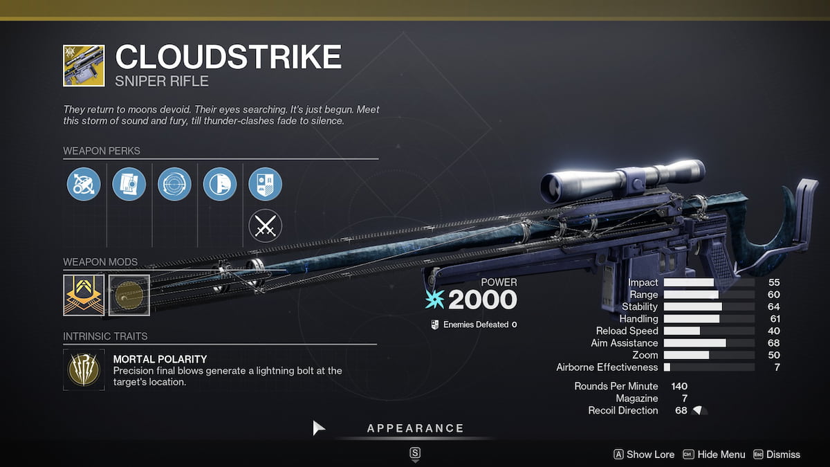 この武器は、PVPで最も人気のあるスナイパーライフルの1つであり、致命的な極性の特典との付随的な損傷を引き起こす能力のためです。致命的な極性は、PVPの内部でガーディアンをワンショットできる最後の打撃の後、ターゲットの位置に稲妻を作成します。