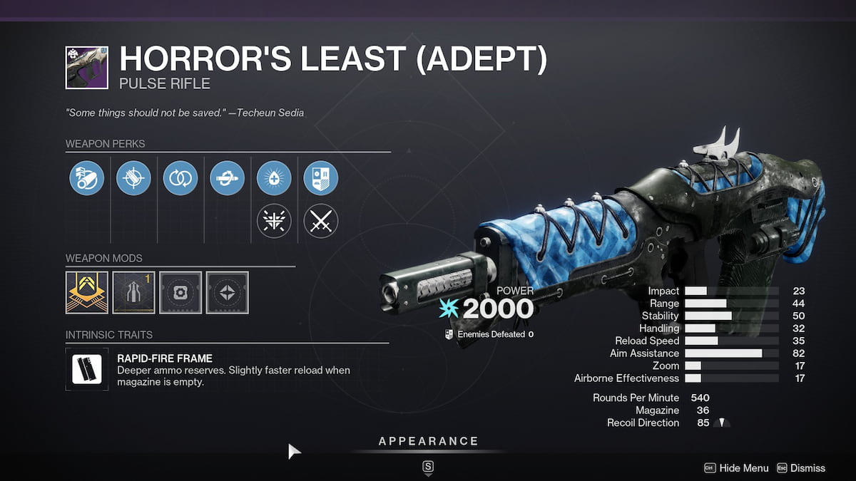 ホラーの最小は、やや普通のパルスライフルです。武器は腐敗した日暮れから落ち、ZavalaからLegacy Gear Focusing Tabで購入できますが、Adeptバージョンは、ホラーの最小の少なくとも毎週の武器であり、長い間ローテーションされていなかった場合にのみ利用できます。