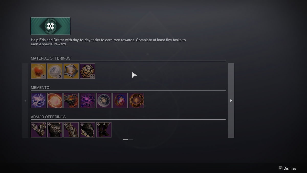 武器と鎧と並んで、過去はプロローグであり、ゲーム内のすべての記念品を提供します(襲撃の記念品を除く)イベントメメント。イベントを逃して、残りのベントトークンを持っている場合、記念品はあなたの武器をさらに光沢のあるように見せるために常に良いです。同時に、あなたが次のようなリソースが少ない場合エキゾチックな暗号、これは補充するのに良い時期になる可能性があります。