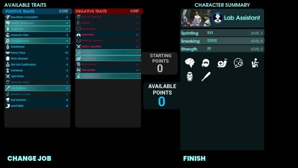 選択した特性は、選択したジョブによって異なります。初期のスキルを向上させる特性を選択することには、真の利点がありません(初期のMGAMEでそれを容易にする以外に)。代わりに、目標は、あなたの生存にあまり有害ではない特性を選択し、他の場所には手に入らない方法で統計を高めることです。これは、ラボアシスタント(ステルス)、キネマティック研究者(戦闘)、および夏のインターン(汎用性)とペアリングするためのお気に入りの特性に関する簡単な要約です。