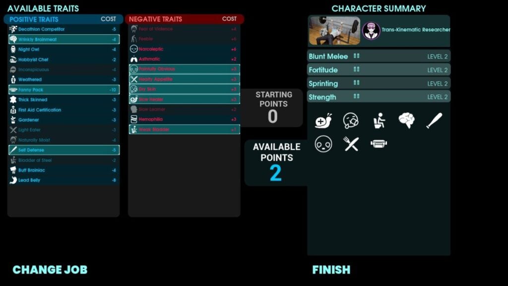 各ビルド/ジョブをユニークにする方法があまりないため、私たちが選んだ特徴に関しては、多くの重複があります。最後に、最悪のネガティブな特性を避けてください:暴力への恐怖、学習者、弱いことは、スキルツリーの進行を妨げ、不必要に生存率を低下させます。