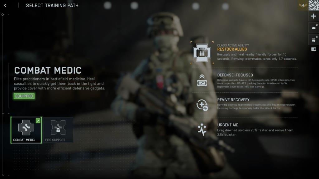 Assault を使用すると、ガジェットとして別のプライマリを持ち運ぶことができます。私の選択は M87A1 です。このショットガンはデフォルトでロックが解除されています。それを変更する理由はありません。トレーニング パスの場合は、Frontliner を選択する必要があります。フロントライナー仕様はより速くより良く回復することができ、サポートクラスとうまく機能します。
