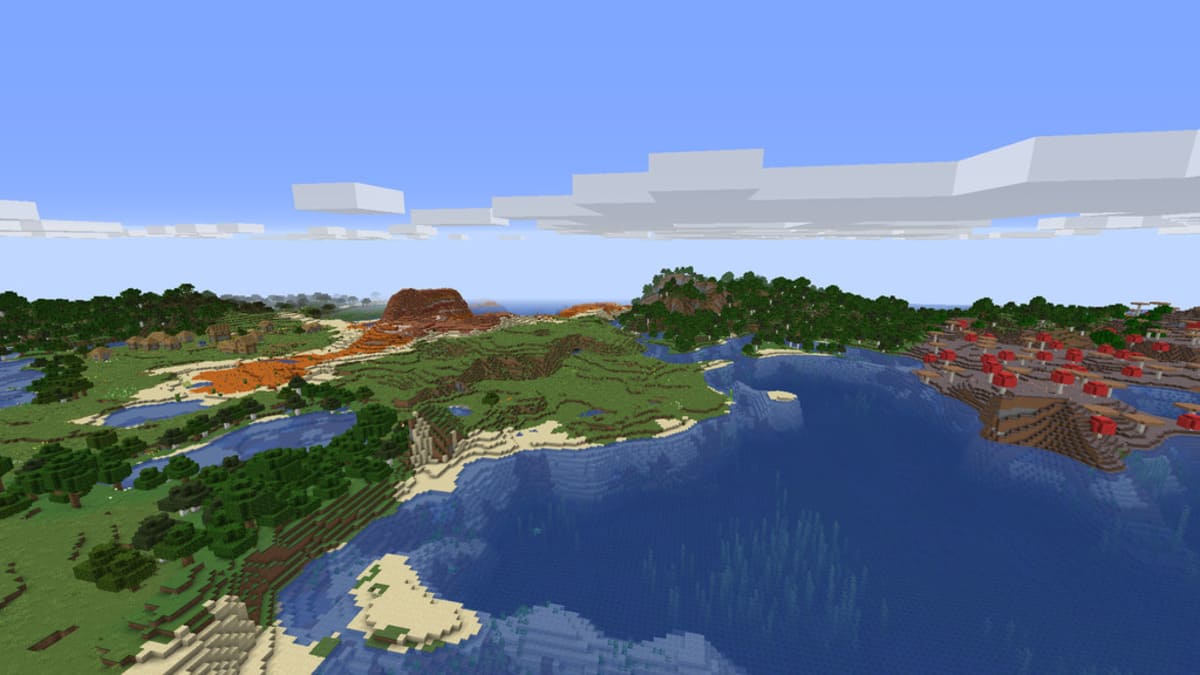 バイオームの汎用性は、どのサバイバルプレーヤーにとっても素晴らしいことです。このMinecraftの種は、スポーンですぐに組み合わされた最も希少なバイオームのいくつかを提供しています:メサとマッシュルーム島。また、非常に近い村もあります。これは、この種に期待できるもう1つの利便性です。ここでサバイバルゲームを開始し、必要なすべての素材にアクセスできます。