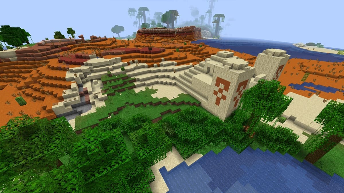 このMinecraft Seedには、ジャングルとメサの2つの巨大なバイオームを分離する薄い縁を収容する2つの砂漠の寺院があります。 Coordinates 1350、1350、および1800、1200にある寺院があります。後者の寺院には、鉄道とカートが公然と使用できる露出した鉱山シャフトがあります。