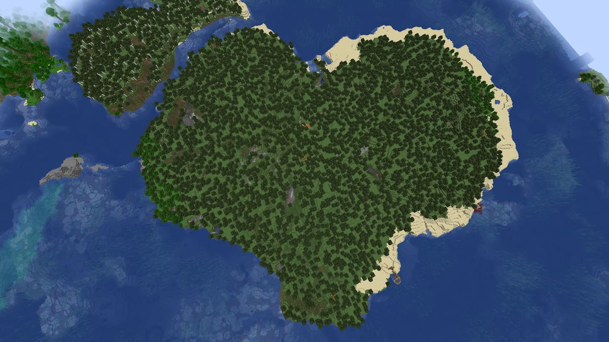 このバーチフォレストアイランドは著しくハート型であり、創造的な世界に最適なスタートとなっています。難破船近くの島の底の一部を取り外して、その形状をより顕著にします。 Javaのプレイヤーは、スポーン近くにいくつかの小さな構造物を見つけますが、ベッドロックのプレイヤーは同じエリアに3つの埋もれた宝箱にアクセスできます。