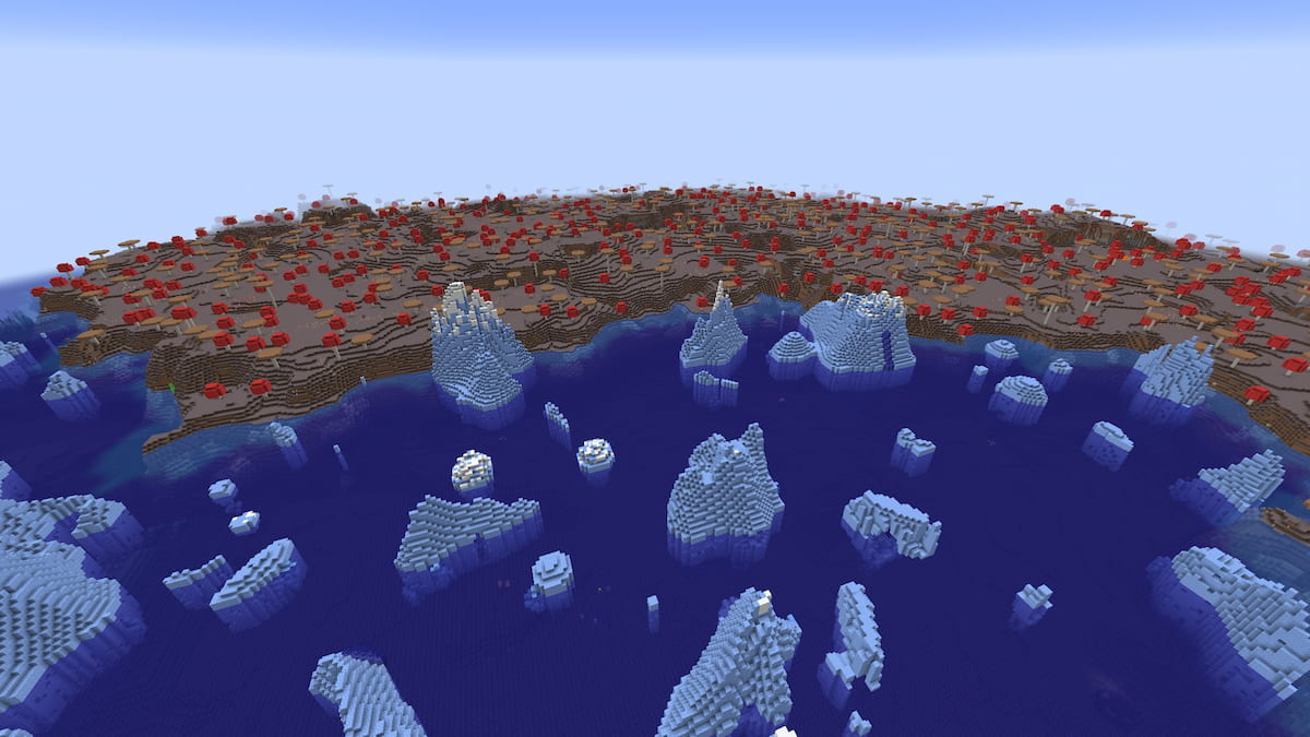 このキノコの島は非常に大きいため、レンダリング距離が完全にマックスされていても、終わりを見ることができません。北半分は大きく、完全に相互接続されていますが、南端は離れてキノコ諸島のラインを形成します。この世界に入るとすぐに、この島に到達することができます。それはおそらくあなたがこれまでにMinecraftで出会うでしょう。