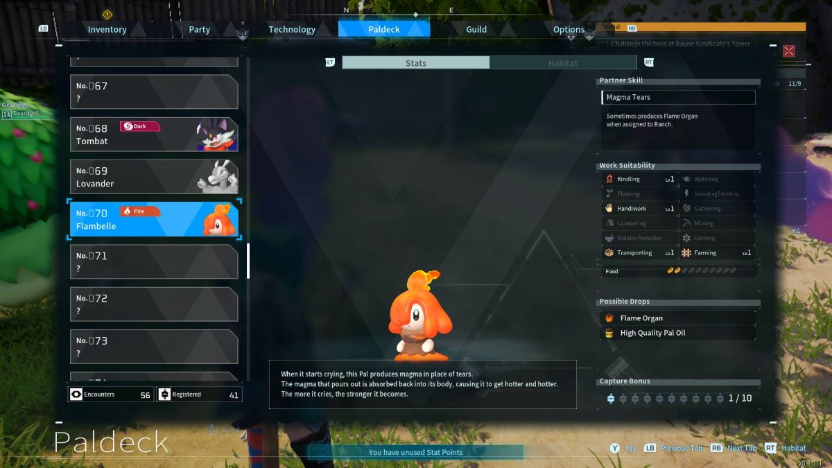 Palworldの基地を維持するための完璧なファイアタイプの仲間を探しているなら、Flambelleを間違えることはできません。私は幸運にも、かなり早い時期に焦げた卵から私のものをhatch化させることができました。 Flambelleが世話をするだけではありませんキンドリング、しかし、それも良いです手仕事、輸送、 そして農業。それは落ちます炎器官で牧場また、火に強い鎧と火の矢のような武器を作る必要があります。
