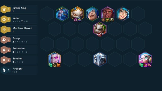 Rebelは速い8コンプであるため、標準のレベリング間隔に従い、他のすべての人よりもレベル8に到達しようとします。レベル8に向かう途中で、いくつかのユニット間でFlexをプレイできますが、垂直反逆者のために行くので、最後まで多くのフレックススロットがありません。目標は、コアユニットを見つけるまで、まともなアイテムホルダーを持つことです。