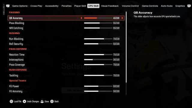 プレーヤーのスキル設定と同様に、Madden 25のCPUスキル設定に調整する調整があります。以下は、スライダーがどのように見えるかです。