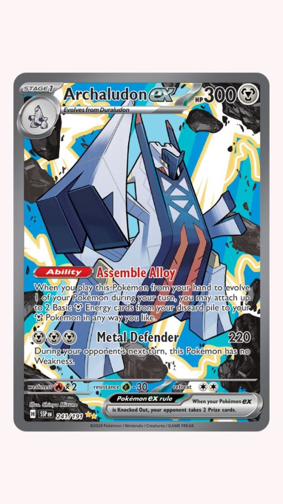 | 合金を組み立てます | n/a | Archaludon Exがあなたの手から演奏されて、ターン中にポケモンを進化させるとき、あなたが好きな方法であなたの捨てられた山からあなたの鋼鉄のモンにあなたの捨てられた山からあなたの捨てられた山に2つの基本的な鋼のエネルギーを取り付けます。 | n/a |