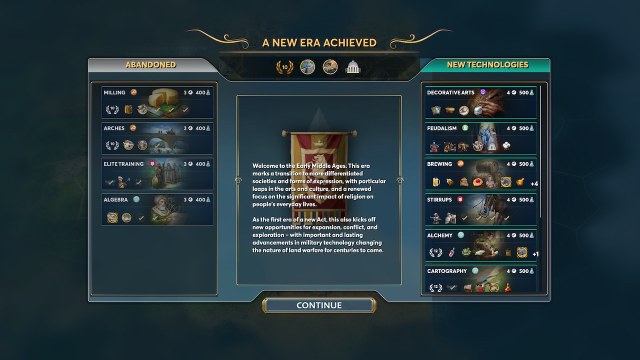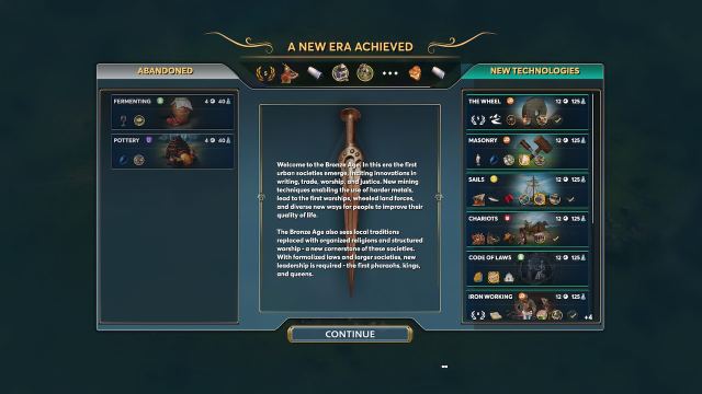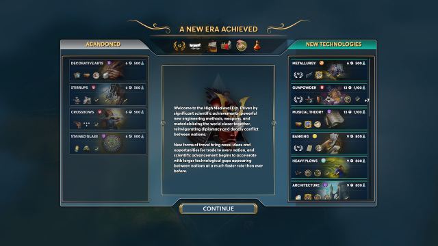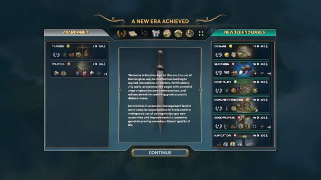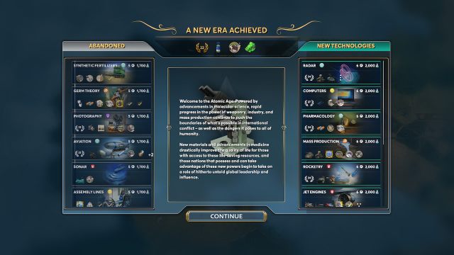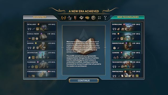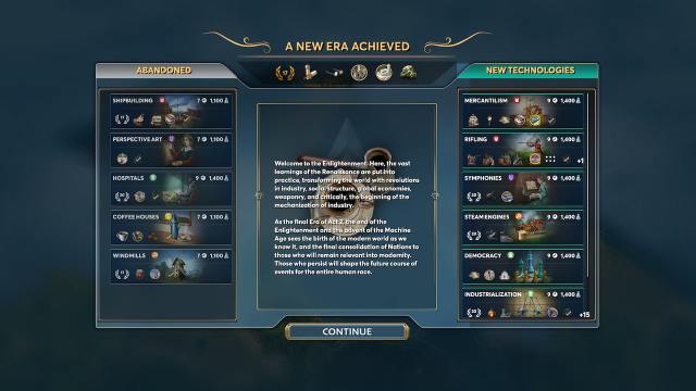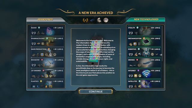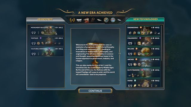 ARA:History Untoldは、4つの異なる年齢で構成される3つの行為を通じて行われます。国が次の年齢に進むためには、彼らは現在の時代の4つの技術を研究しなければなりません。次に、「年齢触媒」と呼ばれる特定の技術。