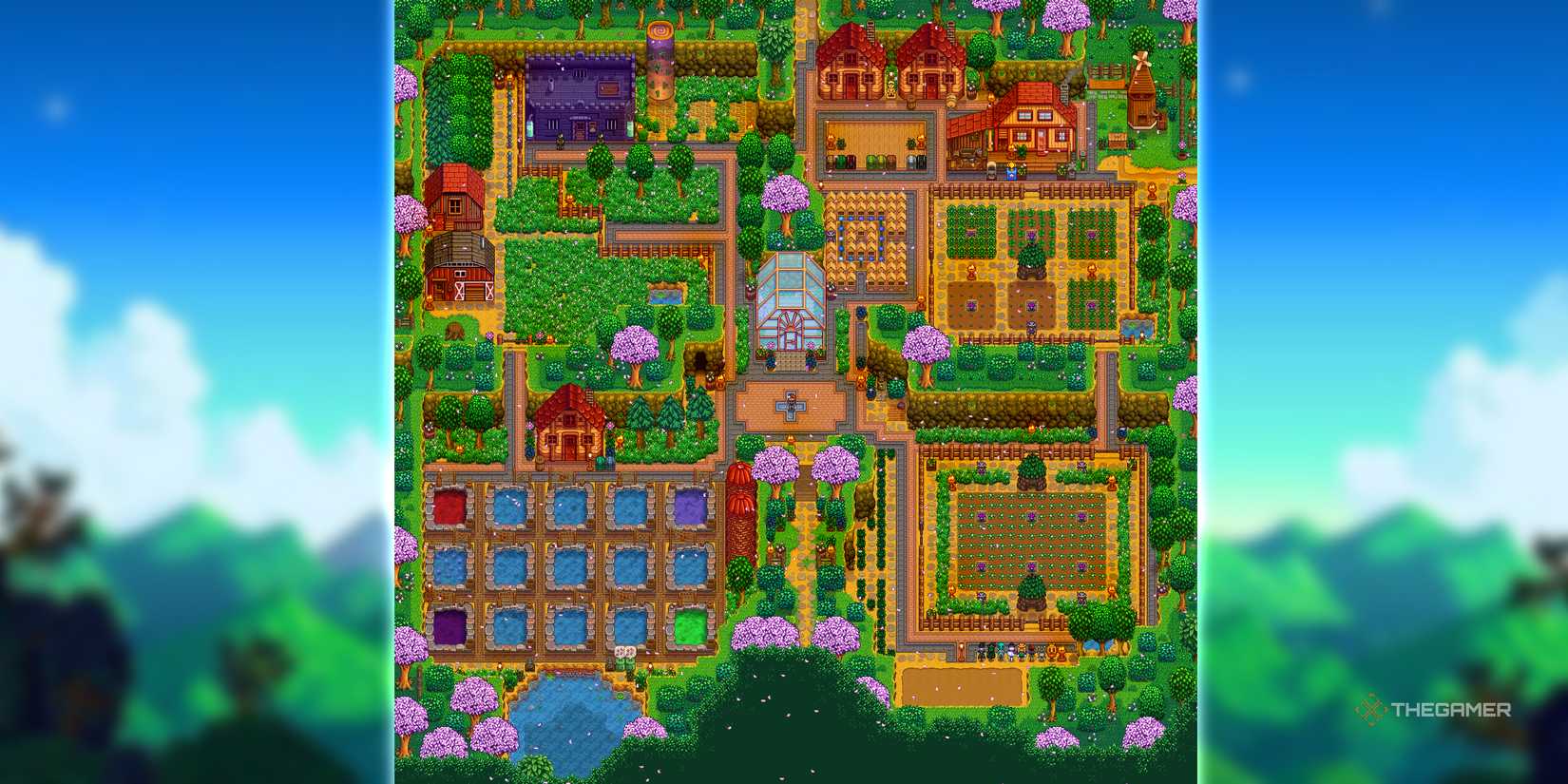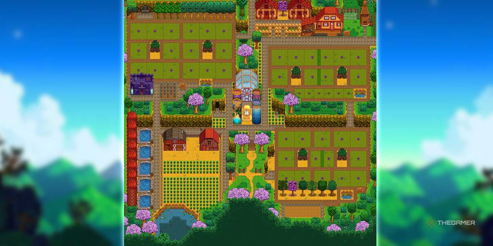 あなたとあなたの友人が高い生活を送り、メインの家のスペースを共有することを好む場合は、4つのコーナーズファームのレイアウトの右下にコテージを送り、そこにフラワーファームを計画してください。動物の左上の象限を節約するため、池とスライムファームには左下の象限を使用してください。