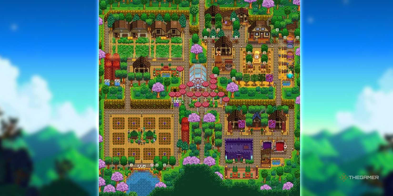 ジュニモの小屋と東にスライム牧場のためのスペースがあり、友人のために郊外に沿ってキャビンを置くことができます。その間、あなたの最愛の小さな温室は巨大なキノコに囲まれています。このレイアウトは、完全な見た目の農場では、機能と美学のバランスを非常によくバランスさせます。