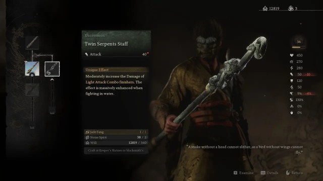| Stormflash Loongスタッフ | 神話 | 140 | New Game PlusでKang-Jinスタッフをアップグレードすることで取得しました。 | 45000 Will、9 Loong Pearl、4 Gold Tree Core、2 Kun Steel |