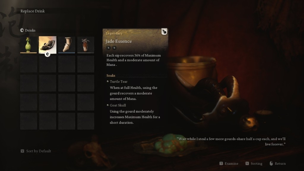 今、あらゆる神社に向かいますbrewメニューの中に入って、ジェイドのエッセンスドリンクとタートルの裂け目を装備しますひょうたんに。