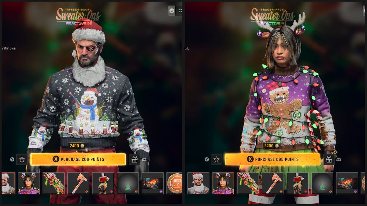 クラシックな「醜いセーター」を試してみることで、この機会に一致させることができますリアクティブ:セーターOPSバンドル。購入には2,400のコラポイントがあり、17.99ドルの費用がかかります。パックには次のコンテンツが付属しています。