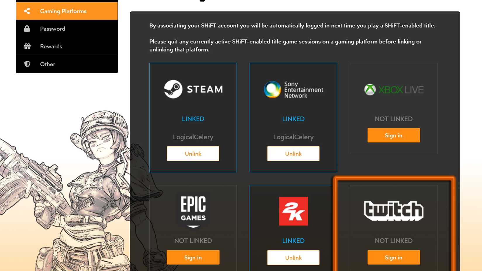 - ShiftおよびTwitchアカウントを作成してリンクします。