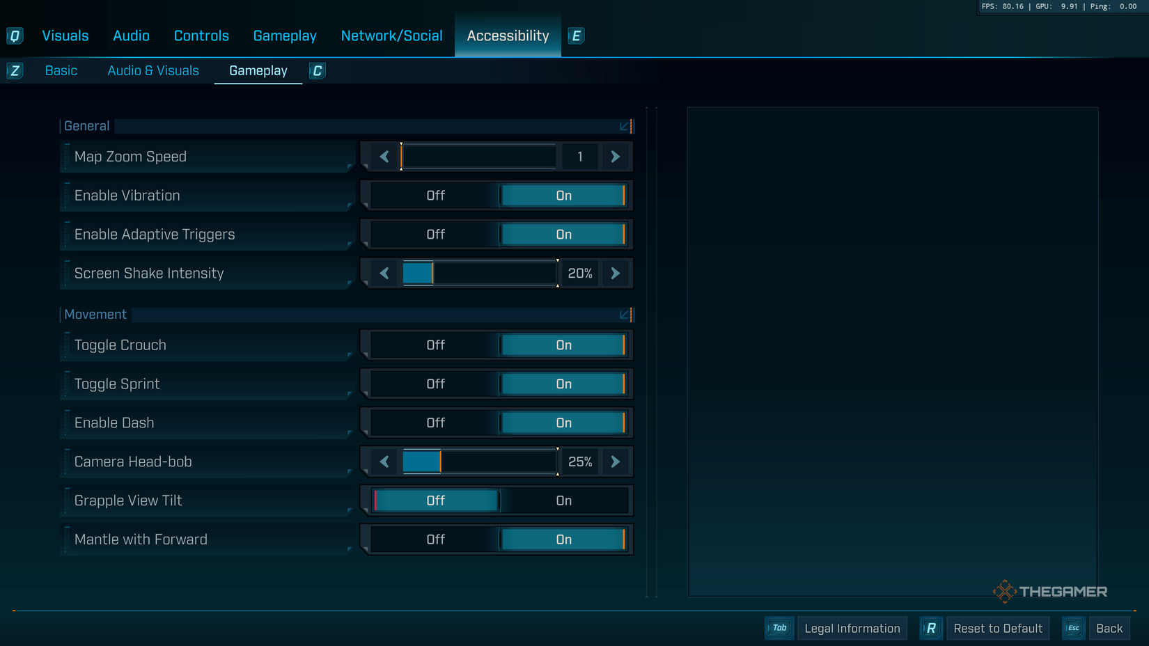 [アクセシビリティ]タブには、調整したいゲームプレイ設定がいくつかあります。強くお勧めしますスクリーンシェイクの強度とカメラヘッドボブの設定を25%以下に下げます。あなたが望むなら、あなたはそれらを完全にオフにすることができますが、約25%の値はあなたを見当識障害にせずに確実なフィードバックを与えます。