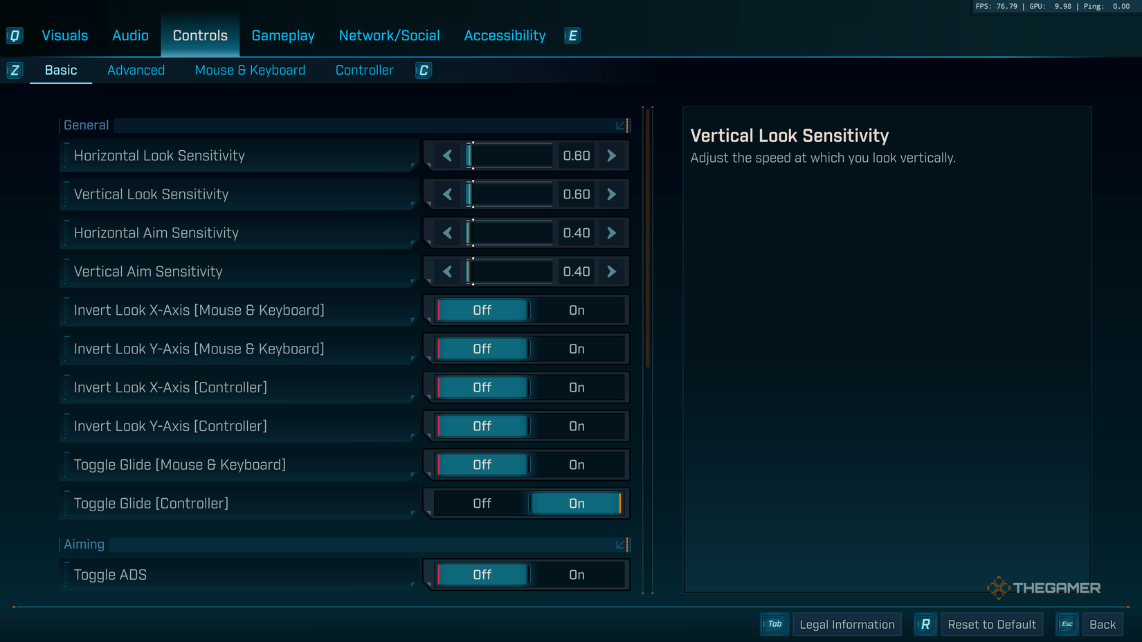 [基本タブには2つの設定があります。ターゲットにスナップし、マウス広告を見てください。Borderlands 4のベースマウスの感度はばかげているので、オプションで調子を整えたいと思うでしょう。基本感度を下げ、さらに低い広告の感度値を作成することをお勧めします。これにより、照準はよりスムーズに感じるようになります。