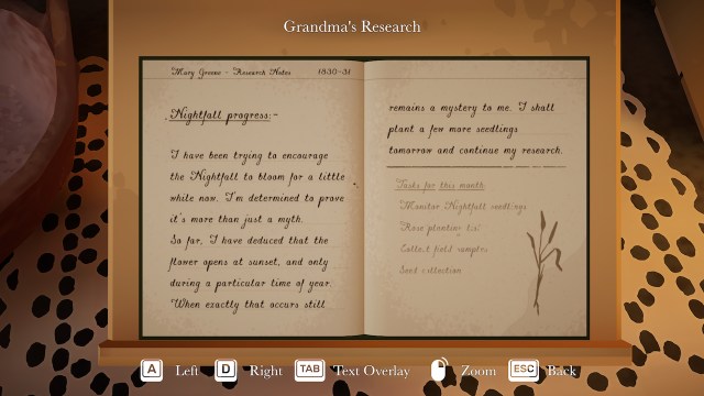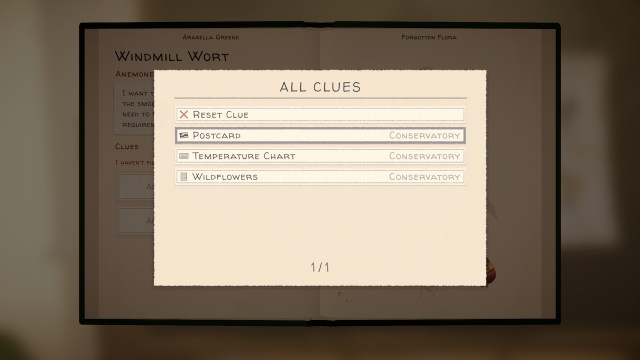 あなたは、部屋のロックを解除するときにあなたを邸宅に連れて行く草本に地図を見つけるでしょう章を進む。各章のページでは、完了する必要がある植物、関連する手がかり、およびその章で見つかった /まだ見つかっていないすべての手がかりのインデックスを明らかにします。