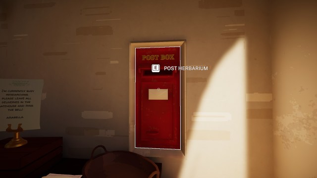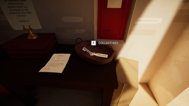 それはaになることが判明しますメモと小包。キーボードの「e」またはコントローラーの「A」を押すことでオブジェクトと対話できます。このメモは、いくつかの研究に着手するために邸宅に戻ったアラベラ夫人としてあなたを告げます。