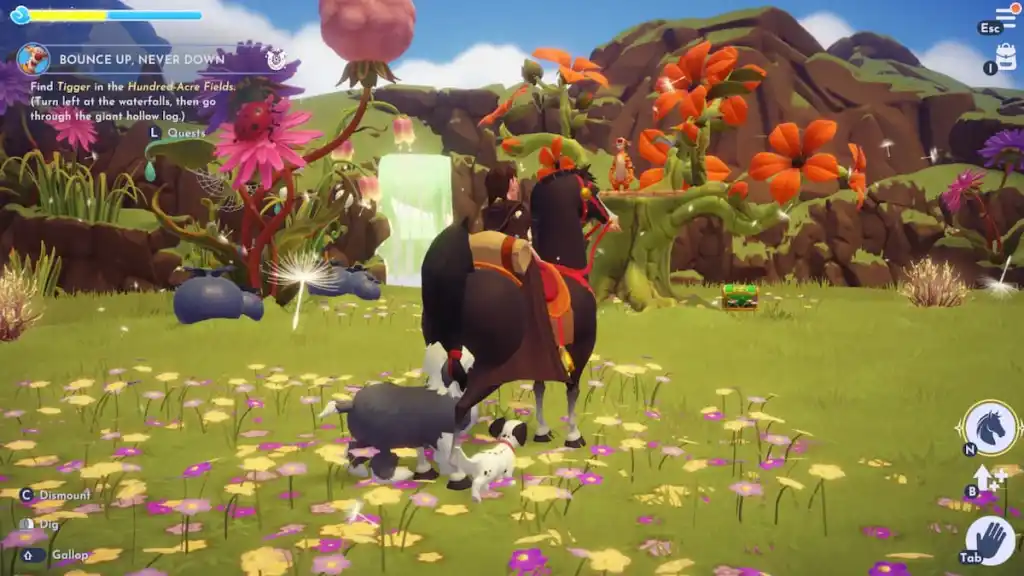 正式に会うためには、ティガーに追いつく必要があります。前に歩いてくださいサンデーショアーズ地域に少し入ってから、通路が見えたらすぐに右折してください分岐します。この道は、滝そして、そこに到達する直前に、次のことを行う必要があります。左折してください。これにより、ピクシー エーカーズの 100 エーカー フィールド エリアにアクセスできます。