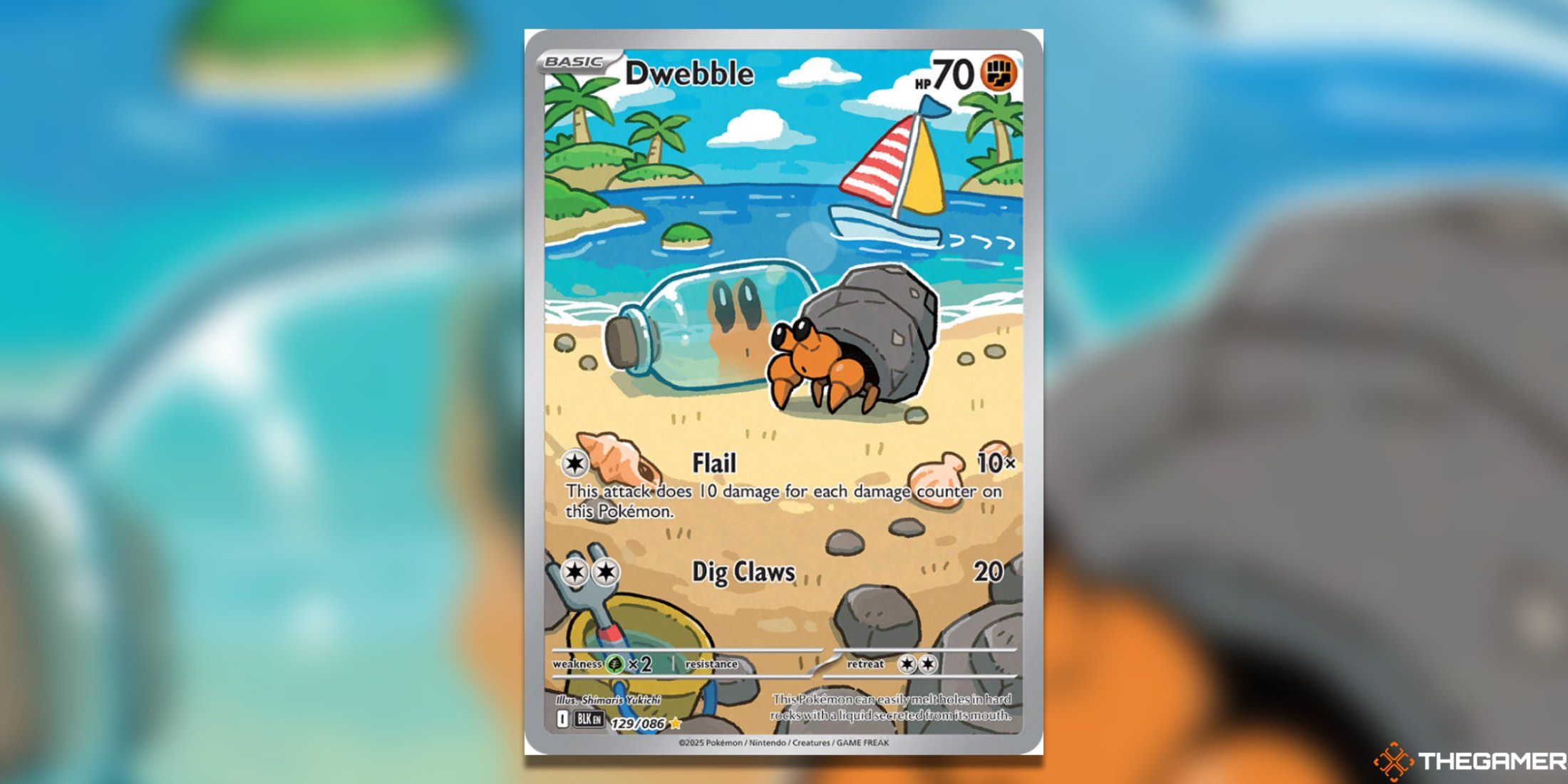 Dwebbleはおそらく、黒いボルトや白いフレアに関するあらゆるリストで見つけると予想される最後のポケモンですが、このアートワークは目を引くのと同じくらい愛らしいです。明るい色と照明は、このカードの視覚的な魅力で役割を果たしますが、シーンの内容はさらに愛らしいです。