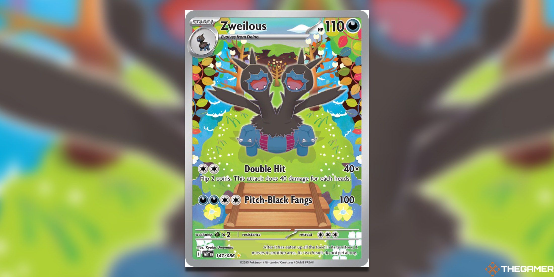 Zweilousは、特にその進化した形であるHydreigonと比較して、複数のScarlet&Violet Eraセットに登場するHydreigonと比較して、あまり愛を得ることはありません。ポケモンを取り外して背景を示した場合、このカードは、いくつかの水の中央にある豪華な草が茂った表彰台に基づいて、完全に進化したポケモンを備えたものだと思うでしょう。