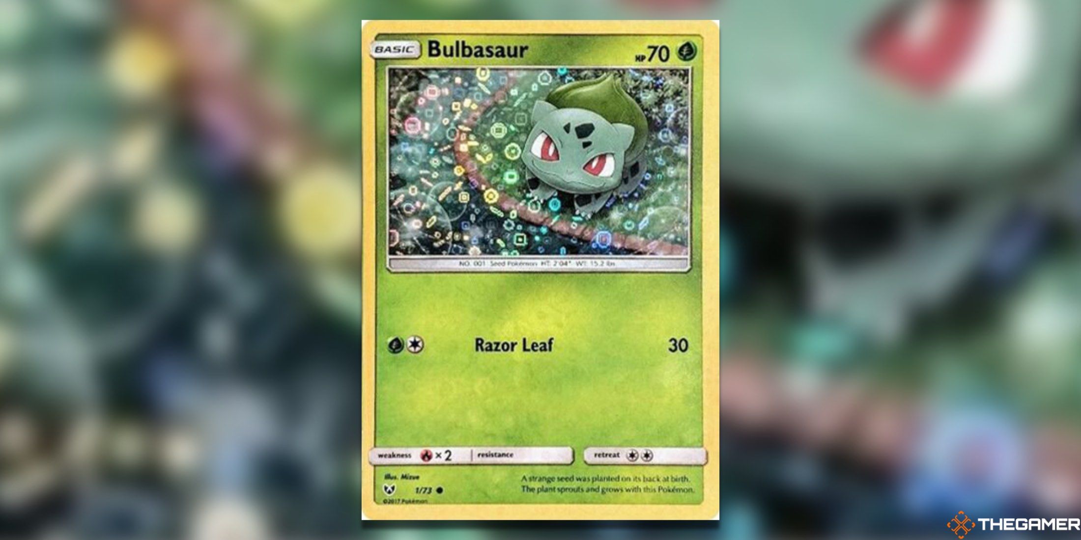 シグネチャーのホログラフィックパターンは、ブルバサウルスの周りに浮かんでいる膨大な量の泡とかすかなディテールのおかげで、このブルバサウルスカードですべての中で最も明るく輝いています。ポケモンでさえ、このカードで提供される視覚的なビュッフェに感銘を受けているように見えます。